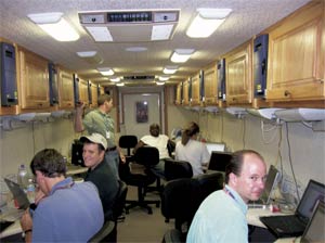 | The Mississippi Global Education Mobile, also known as the Brain Bus, was borrowed from Mississippi State University and used by volunteers around the clock for managing and analyzing data and producing a variety of map products. |