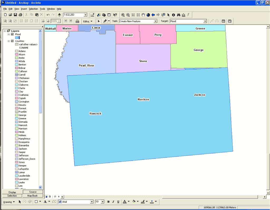 Predicted storm surge depths were provided to the Mississippi Emergency Management Agency (MEMA) through regular conference calls with the Tropical Storm Prediction Center and the concerned National Weather Service offices. The values provided the afternoon before Hurricane Katrina struck on August 29 ranged from 16 to 32 feet. Areas near the Mississippi-Louisiana border would suffer the deepest surge whereas areas near the Mississippi-Alabama border would be less significantly affected. When I started working early the morning of August 28, Dr. Chris Mullens, a structural engineer from the University of Mississippi, was working with HAZUS-MH, a Federal Emergency Management Agency (FEMA)-sponsored damage prediction model that runs within ArcGIS. While the wind portion of the model was running well, there were issues getting the flood/storm surge predictions to work smoothly and correctly. While Chris focused on HAZUS-MH for wind damage estimates, I tackled the storm surge problem.