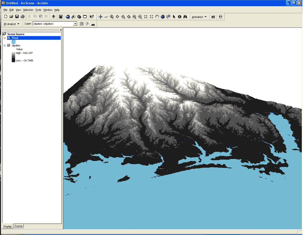 I wanted a quick, down-and-dirty method that would provide information that could be used for guidance [in placing response teams], but that erred on the side of caution. Although there are probably better methods for estimating the storm surge, this is what I came up with on the fly, without much sleep, and under time pressure. In my motel room the previous night, I had downloaded the Jackson, Harrison, Hancock, and Pearl River county digital elevation models (DEMs) from the Mississippi Automated Resource Information System (MARIS) Web site. I used ArcToolbox to convert the downloaded DEMs from .e00 format to DEMs for use in ArcScene in the ArcGIS 3D Analyst extension. As individual DEMs, they were a bit clunky to manipulate in ArcScene and the symbology from one DEM to another differed because each DEM had different elevation ranges.
