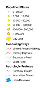 There are three versions of the atlas. The county basemap series is a set of reference maps created using the vector base layers for each county. The shaded relief map series adds a digital elevation model and hillshade to highlight topography. The satellite relief map series uses Landsat TM imagery to provide an overview of land use. Each map series contains 254 county maps produced in a 17- by 24-inch format, and all maps are available for download as JPEG or PDF files.