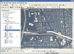 | Using the multispectral DigitalGlobe QuickBird image, it is possible to drop the blue band and change to a false-color image that greatly enhances the clarity. GIS data processing tools take full advantage of the capabilities of the high-resolution satellite camera sensor. |