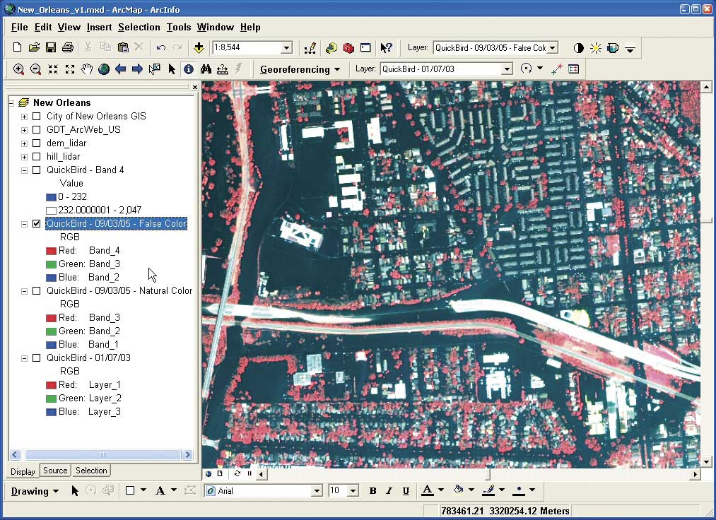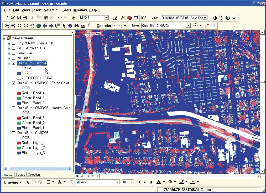 By integrating, managing, and processing many types of geospatial data, GIS makes far more information available to decision makers and others responding to emergencies. Analysis of imagery taken of the aftermath of Hurricane Katrina captured by DigitalGlobe's QuickBird satellite illustrates the ability of GIS to integrate data and create actionable information.