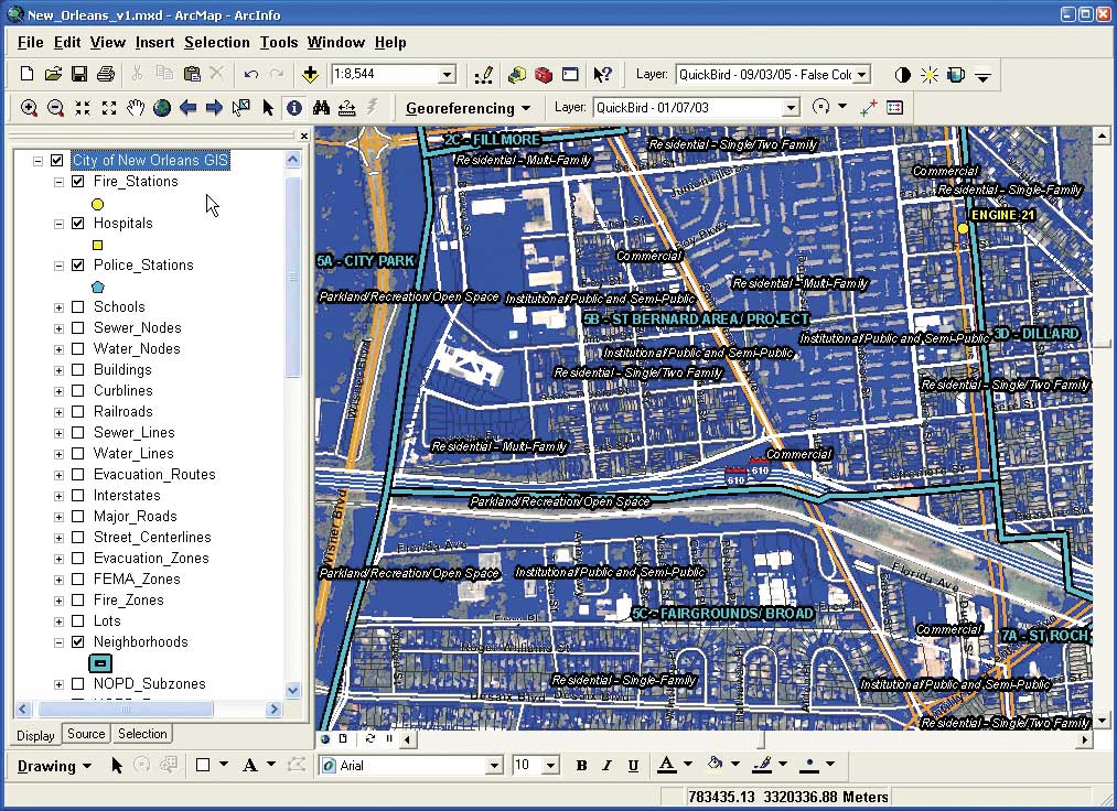 By overlaying current street network data from a commercial Web service, such as Tele Atlas/TomTom, with the flooded areas, the extent of the flooding can be determined. Combining the image and water mask with GIS data from the city of New Orleans that includes the locations of assets (such as hospitals and fire stations) and infrastructure (such as water lines and building footprints) lets emergency managers assess damage to the community. While visualization is an important aspect of communicating geospatially referenced information, GIS provides capabilities for data integration and analysis that generate specific, actionable information. As part of the response to Hurricane Katrina, GIS helped direct rescue efforts, quickly apprise decision makers of complex situations, and collect information to locate missing persons.
