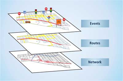 Viewed thematically, the model has three levels: the base network, routes, and events. The base network is composed of individual intersections/junctions and connecting transportation segments (edges). Routes combine multiple transportation segments from the network along with a measure system that can find locations along the route. Events are the assets, activities, incidents, or mobile objects that can be placed based on the route and measure used. The thematic view is most easily understood when visualized as shown in Figure 1.