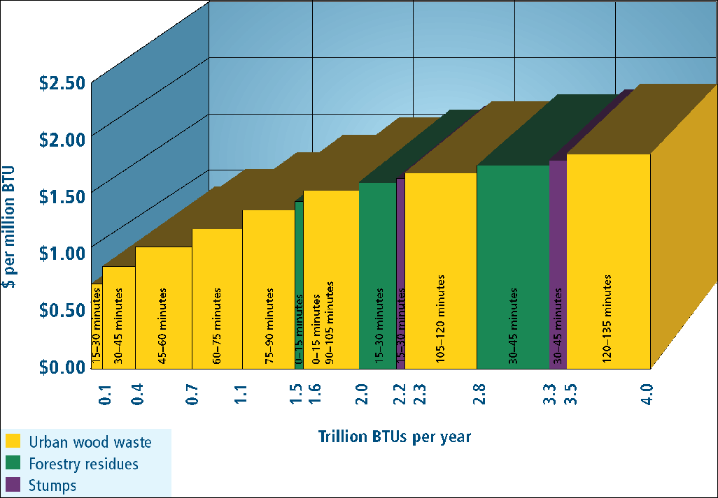 Assessing the economic availability of biomass requires information about production costs and the physical availability of biomass resources in the area of interest. The methods used are composed of the following three components: calculation of transportation costs and haul times, determination of physical availability and geographic distribution of biomass, and creation of biomass resource supply curves. The delivered cost of woody biomass can be defined as the sum of procurement (i.e., the amount paid to gain ownership of a biomass resource), harvest, and transportation costs. This requires assembling procurement and harvest cost assumptions for different types of biomass resources and calculating transportation cost as a function of haul time. GIS is an efficient and useful tool for evaluating woodshed procurement areas and transportation costs (e.g., Young et al. 1991, Brewington et al. 2001, Chalmers et al. 2003). Assessing transportation cost based on haul time rather than distance accounts for site-specific road infrastructure and geographical constraints within a woodshed. Calculating Haul Time