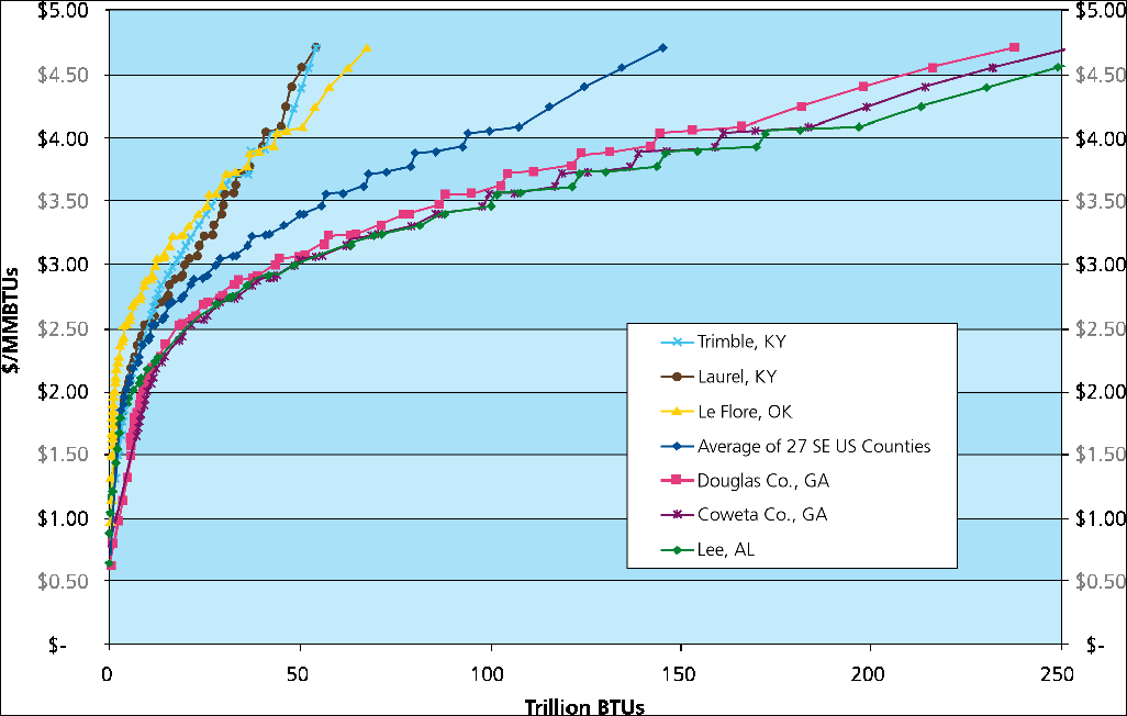 Biomass resources in the southern United States, such as urban wood waste, forest residues, forest thinnings, and others, can be used to generate renewable energy, reduce greenhouse gas emissions, improve forest health, and provide economic benefits to rural communities. The feasibility of bioenergy (i.e., energy generated from biomass) projects depends largely on the availability of woody biomass resources. More specifically, it is the economic availability or total delivered price for a given quantity, rather than just the physical availability, that is relevant to the development of bioenergy projects. Most assessments of biomass availability to date estimate the total amount of biomass within a given straight-line radius and assume average production costs for the area. A more comprehensive economic assessment of biomass resources takes into account that costs vary with biomass type, distance, and transportation infrastructure. When transportation costs are taken into account, more costly resources in close proximity may be economically competitive with cheaper resources farther away, and vice versa. The Wood to Energy program of the University of Florida School of Forest Resources and Conservation, the United States Department of Agriculture Forest Service's Southern Center for Wildland-Urban Interface Research and Information, and the Southern States Energy Board helps communities evaluate the feasibility of using woody biomass for energy production. The project has identified 27 counties in the southeast portion of the United States that have high potential for energy generation from woody biomass. The ArcGIS Network Analyst extension was used in assessing the economic availability of woody biomass resources to these communities. Components for Calculating Economic Availability