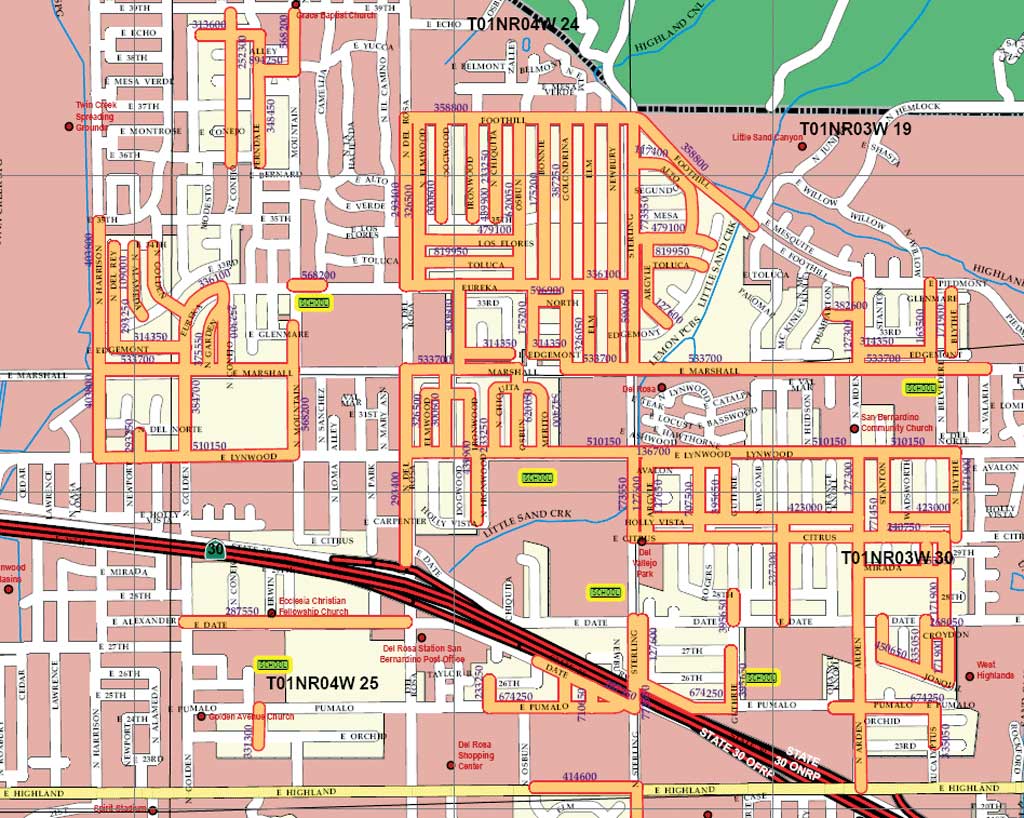 The Department of Public Works�Transportation/Traffic Division is responsible for maintaining more than 2,600 miles of road in a county that covers more than 20,000 square miles. In addition, the Traffic Division is required to annually provide the Controller for the State of California, through the State Department of Transportation, the total road mileage for the County Maintained Road System (CMRS) per section 2121 of the California Street and Highway Code. The department has developed the Traffic Safety Management System (TSMS) and obtained grants from California State Office of Traffic Safety (OTS) to assist in defining high accident locations through traffic engineering investigation. TSMS includes traffic data information such as Average Daily Traffic (ADT), speed zones, and more than 350,000 traffic control devices. Key components of the TSMS are the Traffic Road Book and the County Road System Maps. Working with a Nonautomated SystemThe original County Road System Maps are a set of detailed maps depicting all the roads in the county. Each map page includes other features such as Local Agency Formation Commission (LAFCO) boundaries. Each map was drawn on an individual sheet of polyester film called Mylar. The county acquired the Mylar sheets from the California Department of Transportation in the early 1970s. When the road system changed because a new road was constructed or existing roads were annexed, the Mylar sheets had to be updated using a CAD system or by hand. In the original Traffic Road Book, information about county-maintained roads is recorded as road sequence descriptions and stored in an IBM DB2 database maintained by the Traffic Division. A printout of all the road sequence description records is bound into an eight-inch-thick volume and distributed with any changes or updates. County Road System Maps sets are still in wide use today. Approximately 200 copies are distributed throughout San Bernardino County and are used by traffic safety analysts, road designers, surveyors, contracts personnel, flood control engineers, and planners and at the front counters of various departments serving the public and other government agencies such as the California Department of Transportation. The County Road System Maps are also sold to private entities, such as developers, and other jurisdictions and agencies.