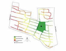 Each street segment and intersection was assigned a unique identification number and was rated for walkability and bikeability after on-site visual inspection. Basemaps were prepared from geospatial data available at no cost from the Kentucky Geography Network to aid in field data collection and subsequent analyses. After the study area was audited, a sample set of streets and intersections was audited again to test the reliability of the audit tool and the team's rating assignment consistency. One team member entered the ordinally scaled qualitative audit data as attributes for a shapefile. The shapefile was used for initial audit visualization and analysis. The hardware used for the data encoding and subsequent analysis was a Compaq laptop with a 2.4 Intel Celeron processor with 1,024 MB of RAM and a 40 GB hard drive. The laptop was configured with a dual screen for efficiency. The data was backed up and shared using a 120 GB external hard drive and the University of Kentucky's network and data servers. Continued on page 2 |