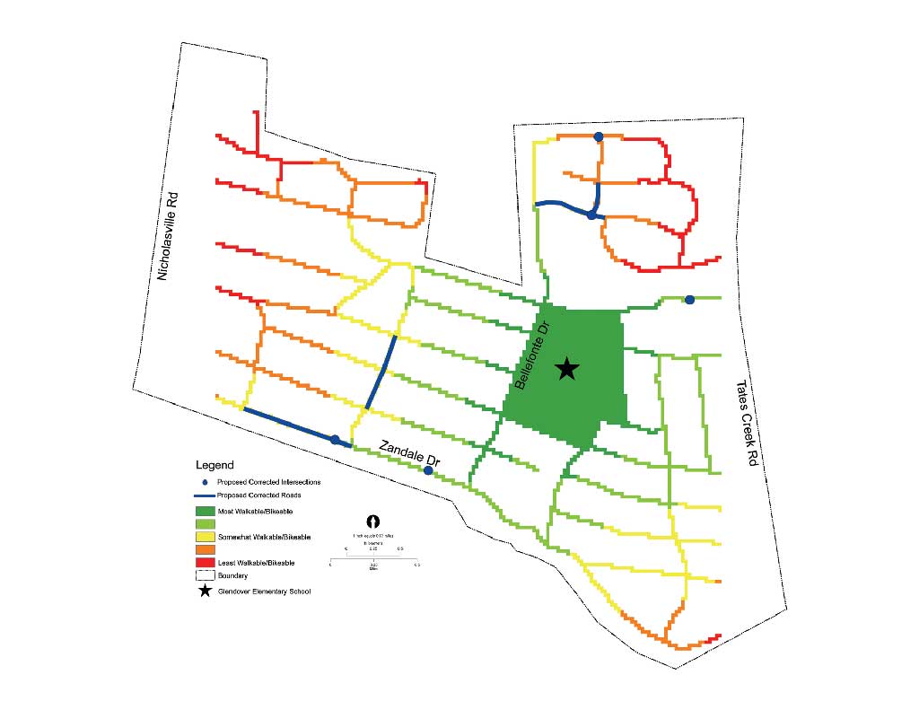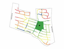 Using the audit data, the team was able to produce a series of maps depicting current walking and bicycling conditions within the project area and another series of maps that included straight-line walking distance, topographic slope, and children density. The straight-line walking distance map was created using the Multiple Ring Buffer tool in Analysis Tools in ArcToolbox. Rings were placed one-tenth of a mile apart with the center located at the neighborhood school. The topographic slope map was developed using a digital elevation model (DEM) downloaded from the United States Department of Agriculture Geospatial Data Gateway. The team used 2000 Census data to generate children density maps. To compensate for the age of the data, the Under Five Years of Age category was used because most likely these children are now five years of age or older and enrolled at the elementary school. The initial audit analyses and ancillary data helped visualize where problems existed and allowed the team to debate strategies on how to improve the walkability and bikeability for the neighborhood school. Visualizing the audit data revealed a string of the least suitable intersections and streets along two road corridors in the study area. The team could now visualize the data but needed a method to move virtually through the study area to evaluate alternative design solutions relative to existing conditions. Least-Cost Path AnalysesTo determine the relative costs of going to and from school for the children, the team used the Cost Distance tool of the Spatial Analyst toolbox in ArcView 9.1 with the ArcGIS Spatial Analyst extension. The Cost Distance tool calculates the least accumulated cost distance to the nearest source over a cost surface for each cell. To use the Cost Distance tool, the team converted the initial vector-encoded audit data to raster surfaces. The team decided to evaluate three strategies to improve conditions based on a combination of the slope, audit, and children density into the overall friction surface. In ArcGIS terms, the friction surface is the Input Cost Raster and is most easily described as a raster defining the impedance or cost to move planimetrically through each cell. By changing the Input Cost Raster surface based on the proposed improvement strategies, the team was able to evaluate overall improvement relative to current conditions. ConclusionThe final analyses evaluated three solutions indicating a 12 percent, 48 percent, and 50 percent increase in overall study area walkability and bikeability. Because 50 percent of the evaluation was based on land slope, none of the three proposals for existing neighborhoods improved walkability and bikeability 100 percent. Although altering land slope is not easily changed in a developed neighborhood, modifying landform is possible when evaluating proposals for other neighborhoods in the planning phase. Thus, slope was included as a factor to allow portability of the methods for comparable results between developments. The student team was able to propose strategies that included a range of on-the-ground changes. Potential changes included adding proper curb cuts, painting crosswalks, adding stop signs, modifying vegetation, and adding sidewalks. These modifications ranged in cost and difficulty of implementation. The students also evaluated not only the types of strategies but also where to implement them. For example, the main trouble areas were found along two collector road corridors where many school-aged children lived. The students focused the recommendations on increasing the walkability only on these two streets. The overall walkability scoring was improved by 48 percent and would have less of a disruption for the residents during modifications (changes to nine intersections) than would be required for 50 percent improvement, which attempted to improve every rated section. Although overall walkability was increased, the team felt it would be the most expensive to implement because it involved more extensive construction projects over a more expansive area. The third approach was to take corrective action on the five most poorly rated intersections and street segments from the initial audit. However, this strategy yielded only a 12 percent improvement in the overall score. The Cost Distance tool enabled the team to visualize and understand that the addition of time and money did not necessarily improve walkability and bikeability in the greatest amount. The team was able to establish that relatively simple/inexpensive design improvements, such as stop signs and well-marked crosswalks and bike lanes along two collector streets, increased nonvehicular transportation options for children traveling to and from school in the neighborhood. The location, as well as the type of improvement makes a difference for evaluating overall neighborhood walkability/bikeability. This analysis and proposal evaluation method allowed for more informed debate among the team members on the best ways to improve walkability/bikeability conditions. Simply by changing the cost friction surface and rerunning the Cost Distance tool, the students could quickly test a variety of design solutions. Although not specifically part of this academic exercise, a cost-benefit analysis could be included for additional help in making decisions. This method could be easily adopted for use in projects underway or planned by government and nonprofit organizations as well as the private sector. For more information, contact Dr. Brian D. Lee College of Agriculture About the AuthorsBrian Lee is an assistant professor of landscape architecture. He received his bachelor's degree in landscape architecture and doctorate at Pennsylvania State University and both master's degrees at the University of Pennsylvania. He teaches land-use planning and GIS courses. Jared Cunningham is a fifth-year landscape architecture undergraduate student at the University of Kentucky. He works par
