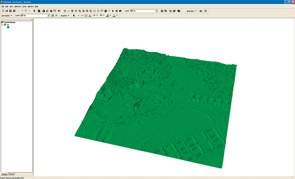 Ottawa County GIS has generated a series of elevation data products from these points and had used the data in many projects, but none like this one. "Lidar has been a rich source of data for us," said Ottawa County GIS manager Aaron Boos. "We've used it in a variety of analysis projects, and it has improved the quality of the maps we can produce. We've provided access to the data to FEMA [Federal Emergency Management Agency] for a floodplain study and the USGS for a new soil survey of our county. But, the GVSU sculpture project is one of a kind." There are two primary types of lidar data: all-points lidar data that includes x, y, and z data for surfaces as well as trees, buildings, and any other object on these surfaces and the bare-earth lidar data that provides a clean extrapolation of the earth's surface without objects. Viviano preferred the all-points data, which would provide an observer with identifiable landmarks when viewing the sculpture. After the initial excitement over the project's concept, obstacles soon developed. One major problem was converting the data into a format usable for Form Z, the Apple-based three-dimensional software Viviano and his students employed. After some initial fruitless attempts, Viviano found that a Virtual Reality Modeling Language (VRML) format was required for the conversion. To convert the lidar data, the author, a GIS technician with Ottawa County, created shapefiles from the all-points data. Each shapefile was checked to ensure any outlying points were removed from the file. Shapefiles were then converted to a triangulated irregular network (TIN) file in ArcScene. The TIN was exported from ArcScene as a WRL file (a VRML format). To comply with the file size limit for each WRL file, data was supplied to GVSU in a series of one-eighth-mile square tiles. The Sculpting Process