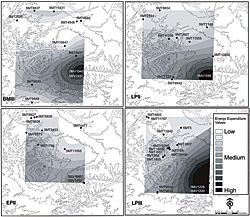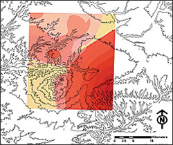 Next, a cost-weight analysis was done to calculate the approximate energy expenditure of people traveling from their homes to a toolstone quarry. Cost-distance values reflect the walking costs in a canyon landscape. In the model, habitations were added as beginning points and quarries were added as destination points. The Extract Values to Point tool, available with the ArcGIS Spatial Analyst extension, was used to approximate the cost of walking to get toolstones for each habitation. Looking at Energy ExpenditureTo visualize how energy-expenditure values are spread across this landscape, the kriging function in Spatial Analyst was used to create maps based on the energy-expenditure values when procuring toolstone materials for several different time periods. This information was thematically mapped. Dark colors indicated high-energy expenditures. White indicates low-energy expenditure. For example, during the early Pueblo II period (A.D. 920�1060), no dark areas are shown on the map. This suggests that early Pueblo II residents expended less energy when procuring toolstones. In contrast, energy expenditure values for the late Pueblo III period (A.D. 1225�1280) indicate that residents in this era appear to have expended far more energy performing a similar task.
