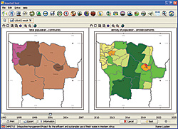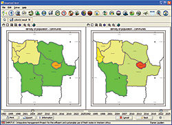 SDSS ArchitectureThe general architecture of the SDSS is illustrated in Figure 1. This SDSS development environment combines the state-of-the-art software and engineering knowledge with spatial data analysis. The expert system shell is placed in the center of the SDSS, which coordinates the whole system. It is responsible for information flows and directs control flows. The communication between the DBMS, Model Base Management System (MBMS), knowledge base, and spatial data handling unit is implemented via interfaces. The interface for a decision maker is usually a GUI that provides access to the system for spatial decision support. While designing and developing question-specific SDSSs, Unified Modeling Language (UML) class diagrams can help describe the structure of the systems and be used as programming schedules for the developer. These class diagrams are static structure diagrams or flowcharts that show the classes of the system, their attributes, and their relationships. After considering the requirements of potential users, several modules were implemented to supply functionality for the ArcGISDoubleMapPanel. In addition to common GIS tools that are integrated in the SDSS toolbar, the panel provides thematic and nonthematic raster and vector maps that can contain either two attributes and one time slider or one attribute and two time sliders (to compare two different time frames). Resulting ToolFigures 2 and 3 contain screen shots of the ArcGISDoubleMapPanel tool during preliminary development of the SDSS. Two PageLayoutBeans, which have toolbars with common GIS tools and time sliders (for visualizing multitemporal time steps), were used. By displaying two feature layers with different attributes that are thematically mapped, the user can intuitively compare these attributes. A Java slider (JSlider) component, located below the two maps, allows the user to view changes in the scenario over time. This slider has access to multitemporal feature layers and provides different time increments. Using a processor that accesses the specific time step of the layer, the two maps of the ArcGISDoubleMapPanel are updated (using refresh) during run time. Based on the classification applied to the map, layers change color in response to movement of the time slider. In Figure 3, the ArcGISDoubleMapPanel displays feature data classified by one attribute. The user visually compares two maps from different time spans. This provides an easy way to detect change over time. Each PageLayoutBean has its own time slider. ConclusionModern computer-based spatial SDSSs are comprehensive and complex systems that compile individual decision steps in one overall software structure. They can be customized to the needs of individual users based on a given logical decision tree that was predefined by users and developers during the design process. Using ArcGIS Engine, comprehensive ArcGIS functionalities and partly remote-sensing analysis were incorporated in the SDSS. ArcGISDoubleMapPanel can be used as a multitemporal scenario viewerfunctionality that is not yet available in most GIS software and SDSSs. This tool incorporates vector as well as raster data and provides ArcMap functionality for visualizing one or two attributes for different time periods based on a preselection. In addition to simultaneous visualization of multiple scenarios, the ArcGISDoubleMapPanel is also useful for performing change detection analyses, assessing current conditions, and predicting future situations. About the AuthorsDr. Rainer Laudien is a postdoctoral research fellow in the Bundesministerium f�r Bildung und Forschung/Federal German Ministry of Education and Research (BMBF) project IMPETUS Westafrika at the University of Cologne. His major field of work is software development for spatial decision support systems by using GIS, model, and remote-sensing data. Sebastian Brocks is a student assistant in the BMBF Project IMPETUS Westafrika at the University of Cologne. His major interest is software development, specifically integrating ArcGIS Engine components in custom applications. Stefan Weyler is a student assistant in the BMBF Project IMPETUS Westafrika at the University of Cologne. His major interest is XML programming and system configuration. Dr. Georg Bareth, a professor at the University of Cologne, heads the GIS and Remote Sensing Group in the Department of Geography. His major research interests are in mobile GIS applications and location-based services, GIS-based regionalization of N- and C-dynamics in ecosystems; analysis of multispectral, hyperspectral, and radar data for land-use mapping; the application of GIS and remote sensing for agricultural purposes; terrestrial laser scanning; and geographic databases. AcknowledgmentsDevelopment and implementation of the SDSSs are carried out for the interdisciplinary research project IMPETUS (an integrated approach to the efficient management of scarce water resources in West Africa. See www.impetus.uni-koeln.de). The programmed systems are implemented in the Impetus Spatial Decision Support System (ISDSS), a Java/XML-based framework. This study is part of that interdisciplinary scientific project and is supported by the BMBF under grant No. 01 LW 06001A and 01 LW 06001B as well as by the Ministry of Innovation, Science, Research and Technology of the federal state of Northrhine-Westfalia under grant No. 313-21200200. |
