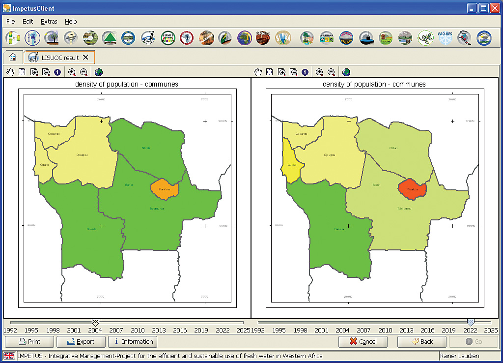 Spatial data, quantitative and qualitative models, and expert knowledge are now often included in computer-based spatial decision support systems (SDSSs) because users require a comprehensive system that supports complex decisions. SDSSs are developed based on predefined, multifarious logical decision trees that are focused on a specific question. SDSSs developed for environmental and social research, as well as other disciplines, must compare different scenarios. A SDSS was developed for the GLOWA IMPETUS research program. This article describes the development and implementation of a specific GIS visualization tool, ArcGISDoubleMapPanel, that is part of the SDSS. The tool lets the user evaluate two multitemporal layers in one panel. [GLOWA, or Global Change in the Hydrological Cycle, is a program to develop solutions for those who use and manage water resources in West African countries. The IMPETUS project, a joint venture of the universities of Cologne and Bonn, Germany, employs a holistic approach for analyzing and forecasting the effects of the global change on water resources in two river catchments in West Africa: the wadi Dr�a in southeast Morocco and the Ou�m� River in Benin.] Choices and ConsiderationsFor creating systems and interfaces for the GIS-based SDSS, Java was chosen as the programming language. Java's components and libraries acted as an interface between the GIS, remote sensing, decision support system (DSS), and geodatabase modules. Developing the source code in Java, these modules can be connected to create a comprehensive SDSS that answers specific questions. Using this platform-independent programming environment, the Java developer can create user-friendly GUIs that allow decision makers to choose default expert input variables or customize SDSS parameters (e.g., model variables) based on their knowledge. Eclipse software development kit (SDK), which contains the Eclipse platform (Eclipse 3.2), was used as the project's programming environment because it comes with tools for Java programming and an environment for developing Eclipse plug-ins. In addition to JavaBeans [the reusable software components of the Java 2 platform], specific GIS and remote-sensing components implemented in ArcGIS Engine were easily integrated into the developed source code. Geodata files in raster, vector, and alphanumeric formats were stored in file geodatabases. File geodatabases deliver high performance when handling large datasets and do not have an inherent size limit. Using advanced SDSS techniques, design and development were accomplished using the Model-View-Controller (MVC) approach. [MVC is a programming design pattern that solves dependency problems associated with applications that contain a mixture of data access code, business logic code, and presentation code by separating core business model functionality from the presentation and control logic that uses this functionality.] Single modules of the SDSS are programmed as pipeline functionalities and processors and can be implemented into an integrated software framework. Most decision makers who will use the system are subject area experts who have limited experience with computers generally, and GIS and SDSS software in particular. During the design process of computer-based decision systems, acquiring detailed information about the requests, knowledge, and personal needs of potential users was essential. Programming innovative SDSSs depends on assessing decision makers' knowledge of GIS, remote sensing, and models. The application needs to be easy to use. Nevertheless, the finished product should also benefit advanced users who have detailed knowledge of computer models and GIS and are able to implement additional functionalities into the decision-making processes. Therefore, the SDSS had to incorporate both standard and advanced GIS functionality. In addition to spatial analysis tools, SDSS interfaces should enable the importing and exporting of geodata and models as required.