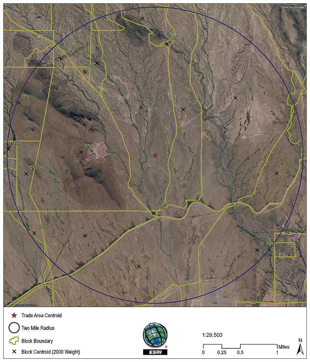 Demographic data is tabulated and reported for standard geographic areas that range in size from states to census blocks. Standard geography encompasses areas that are predefined for a specific purpose: government entities like states, counties, or incorporated places; postal delivery areas (ZIP Codes or carrier routes); political areas such as congressional districts and voting districts; and statistical areas like tracts and block groups that are designed to report census data for neighborhoods or blocks, the smallest areas for which data is tabulated from the census. Despite the versatility of the areas for which data is routinely reported or estimated, most data users prefer to define their own areas or polygons. Approximately 80 percent of the users who access Business Analyst Online, Esri's online reporting system, define their own polygons rather than use standard geographic areas. Understanding Estimate MethodologyTo understand the relative accuracy of estimates for user-defined polygons, it is useful to know how data is estimated for ad hoc polygons. Estimates for any area can be retrieved if the component census geography is known. First, the boundaries of the site are identified. Any shape is possiblecircle, square, or polygon. Circles are common and easily defined by a radius from a given point. However, circles may be modified to represent a trade area more realistically by incorporating natural features, such as rivers and mountains, or drive times to capture the traffic flow. Next, the underlying census geographic areas for a site are located via centroids. Expressed as latitude/longitude coordinates, centroids approximate the geographic centers of areas as small as blocks. If the centroid of a block falls within the site, it is completely included. Blocks are aggregated, and the ratio of block totals to their respective block groups is used to apportion demographic characteristics to the site. Data is apportioned from the block groups using differential weights: population, households, housing units, or businesses specific to the data in question. Blocks are the smallest geographic areas, but only complete count census data is reported by block. Block groups are the smallest areas for which complete count and sample data from Census 2000 are reported. The combination provides the full range of census detail for estimating data for any site. To date, this technique has applied the relationship between the blocks and the block groups from the most recent census. For most areas, the application provides a good estimate for the polygon. If the relationship between the component blocks and the block group has changed significantly since 2000, then the estimate cannot incorporate that change unless both the blocks and block groups are updated. Since that data is now eight years old, it can limit estimates for areas that are changing rapidly or preclude estimates of areas that had no population or housing at the time of the last census. Dealing with Differences in Data CurrencyThe map in Figure 1 shows a sample area located northwest of Phoenix, Arizona. In 2000, this area was primarily desert. The site includes 18 block points, but only one block had housing and a weight relative to its block group of 0.19 percent in 2000. Housing in this block group has almost tripled since 2000. However, using the 2000 ratio would yield an estimate of only 19 housing units in 2008.