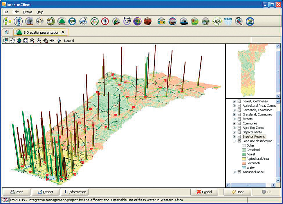 To include GIS and remote-sensing functionalities in the SDSSs, the Esri developer library for ArcGIS Engine 9.2 was used to program these systems. With ArcGIS Engine, a software developer can implement spatial analysis functions within computer-based spatial decision tools. To execute these SDSSs, the Java Runtime Environment (JRE) and ArcGIS Engine must be installed on the computer. The SDSSs were developed using the Eclipse software development kit (SDK). During the programming process, specific ArcGIS Engine components and other libraries, such as the POI-HSSF components furnished by Jakarta POI Java API for reading Microsoft Excel '97 file formats, were used in addition to standard JavaBeans [the reusable software components of the Java 2 platform]. Alphanumeric data and rasters, vector, and other geodata for individual SDSSs are stored in ArcGIS 9.2 file-based geodatabases. Resulting ToolsThe ArcGISDoubleMapPanel was specially developed for environmental and social research, which requires the ability to compare different scenarios. With the help of two PageLayoutBeans, two feature layers with different attributes can be displayed and the user can intuitively compare these attributes. A Java slider (JSlider) component located below the two maps allows the user to view changes in the scenario over time. This slider has access to multitemporal feature layers and provides different time increments. Alternatively, the ArcGISDoubleMapPanel displays feature data classified by only one attribute. The user is able to compare two maps or even a map and a static figure, like an age pyramid, visually. In the latter case, ArcGISDoubleMapPanel provides an easy way to give the user more detailed information, for example, population information for specific communes in the research area for a selected year. Using a specific processor that accesses the specific time step of the layer, both PageLayoutBeans of the ArcGISDoubleMapPanel are updated during run time. Based on the classification applied to the map, layers change color or age pyramids change shape in response to movement of the time slider. The 3D-ArcGISScenePanel was developed for another SDSS. It is designed to optimize production systems under climate change and visualize eco-volume data within tropical agricultural science. Besides the use of the common ArcGIS tools provided by ArcGIS Engine, this graphical user interface (GUI) provides the user with the opportunity to rotate the 3D map in all directions and get a useful overview of a certain region of interest. In addition, specific 3D objects are included. Hence, within the IMPETUS client, three-dimensional vector and raster layers can be displayed and analyzed with the help of the 3D-ArcGISScenePanel.