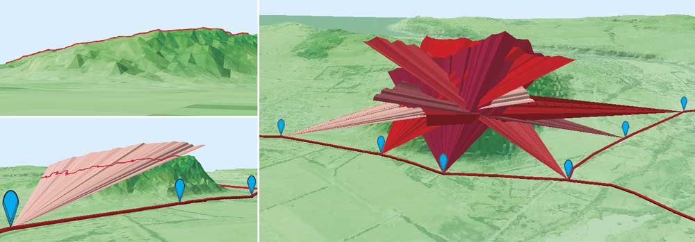 The area of interest is behind a ridge, so the first task is creating a barrier (or fan) that defines the separation between the sky and the ground from each view position. In this example, only the elevation surface is being used to generate the skyline features. If existing structures were in this vicinity, they could also be included in the calculations. The workflow for this example is