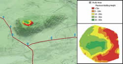 These 3D vertical lines can be converted into maximum height construction zones. The top points can be used to create a new TIN surface using the Create TIN and Edit TIN tools. This surface defines the top of the volume that is hidden from view. Comparing this surface to the base elevation surface using the Surface Difference tool will result in a raster in which each cell value represents the hidden building height for that area.
