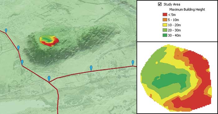 Displaying this raster output using a simple class-breaks renderer completes the analysis of this problem. This layer can be viewed in 3D or copied into ArcMap and shared as a 2D map. The layer makes it simple to identify where structures of a certain size can be built that while remaining concealed from view on the roads.