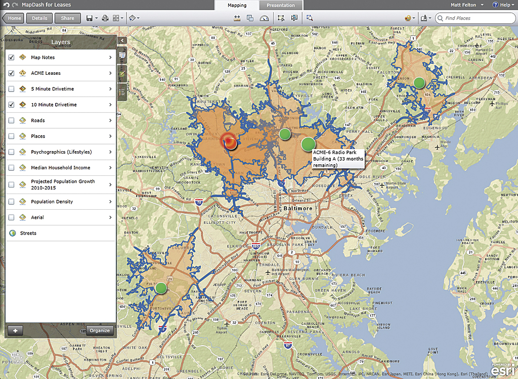 MacKenzie brokers and retail partners can present retail centers in the most positive light using an online dashboard created by Felton. MapDash, built on ArcGIS Online for Organizations, a cloud-based solution from Esri, provides designated staff with secure access to information from anywhere.