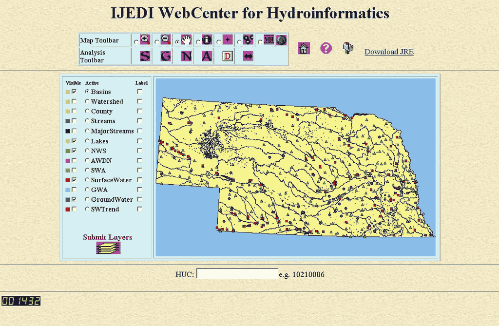 For hydrological data, stream flow, groundwater level, and precipitation measurements are representative data sources for each water basin. The hydrological information for surface water and groundwater is obtained from the USGS Water Resources of the United States Web site. The USGS National Elevation Dataset was used for topographic data and translations into shaded relief, aspect, slope, and terrain parameters for 8-digit HUCs. Data came from the SW, GW, NWS, and High Plains Regional Climate Center's Automated Weather Data Network (AWDN) stations. However, only stations that had more than 30 years of continuous data were used in this study. For precipitation, all 274 NWS and 46 AWDN stations in Nebraska were used. For the stream flow and groundwater level, only 124 of 274 SW and 74 of 166 GW stations were used. ArcIMS-Based DesignTo analyze, visualize, and disseminate the results of the IJEDI project, the authors built the IJEDI WebCenter for Hydroinformatics (water.unl.edu). At this site, users can create customized maps as well as seasonal and long-term trend analyses. Specific implementation steps included using