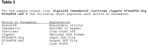 and Processing DLG Files into DXF Files The following switches work well with AutoCAD 12, 13, and 14: /3d /h=12 /no=lines /no=comments /type=o You may want to experiment with switches that serve special purposes, such as the /G switch to convert UTM to geographic latitude/longitude coordinates in NAD 27. In automated mode, the program first prompts for the AutoCAD version. Version 12 is the recommended default. Enter Switches [H=12]: <RTN>. Additional switches may be added here. Next you are prompted to enter the file names of the input files. Type the path and name of the DLG file you wish to process. If you use wild cards such as *.DLG or DV1*.DLG to process several DLG files into one drawing, make sure the resulting file will not be an unwieldy size. The program then prompts for the output file name. Enter the first eight characters of the input file name and add the DXF extension. The USGS convention is recommended (e.g., DV104.dxf for multiple data types or DV1hpf04.dxf for single data type). Finally, the program prompts for line width. A value of zero (0) is recommended. Enter line width [0]: <RTN>. Sit back and watch the program execute. An alternative to using an interactive DLG to DXF conversion procedure is to use a DOS batch file to automate data conversion. The batch file calls the DLGLX149 program, applies necessary switches and parameters, and specifies input DLG and output DXF files. The batch file is first created in a text editor and should be stored in the same directory as the DLG files and the conversion utility. Each batch file line includes seven items. A separate line is created for each input/output desired. A single line from a typical file is shown in Figure 3. The batch file automates extraction and permits the user to quickly repeat a conversion step if the first pass does not execute properly. If certain DLG files do not convert properly, simply delete the incorrect resulting DXF file, edit the batch file to fix any errors, and rerun the corrected batch file. Correct DXF files in the project directory will not be rewritten. The batch file can also be copied to a new project area, edited, and used as a template for additional conversions. Summary