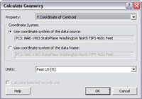 The geometry that can be calculated depends on the feature used. Polygon features have the most options: area, perimeter, x-coordinate of centroid, and y-coordinate of centroid. Point features have the fewest choices: x-coordinate of point and y-coordinate of point. The x-coordinate of centroid and y-coordinate of centroid can be calculated for line and annotation features. The length of line features can also be calculated.