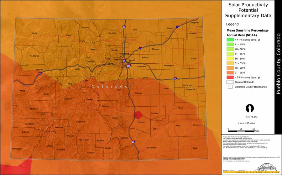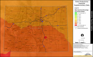 ![]() Using GIS to map mean sunshine and resulting solar productivity potential helped Pueblo County win a solar energy production facility bid. |