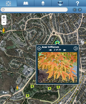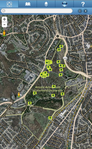 Using a new mobile mapping application developed with ArcGIS, visitors to The Arnold Arboretum of Harvard University can stroll through the lush garden with their smartphones and locate and learn more about the arboretum's unique botanical collection. By tapping icons on the smartphone screen, they can find trees and plants, such as a full-moon maple in North Woods, the witch hazel near Hemlock Hill, and the Japanese beautyberry in Leventritt Shrub and Vine Garden.
