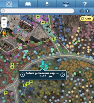 In MIM, about 15,000 dots—each representing a plant—populate a basemap of the arboretum grounds. Tapping one of those dots activates a pop-up window that contains more detailed information on that specific plant—its age and condition, where the arboretum acquired it, its latitude and longitude in the arboretum, and other information.