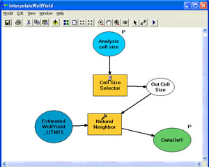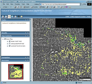 To illustrate the power of geoprocessing on the server, I built an example that uses a map service and an embedded model that allows users to execute an interpolation on the server and view those results in the Web mapping application. The map service contains a point dataset describing the potential water yield from water wells drilled in Douglas County, Kansas (data courtesy of the Kansas Geological Survey and the Kansas Geospatial Community Commons). The model takes in the water well dataset and a user-defined cell size. This information is passed as input parameters to the Natural Neighbors geoprocessing tool. The output is a raster dataset. The output is then rendered using a predefined layer symbology file (or Layer file).