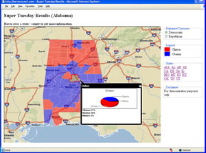 To demonstrate what you can do with the ArcGIS API for JavaScript, the ArcGIS Server team created a live example using the Super Tuesday election results. The mashup created with the ArcGIS API for JavaScript shows which candidates received the highest percentage of votes for each county in the states that held Democratic and Republican primaries. To learn more, visit the Esri ArcGIS Server Development Blog.
