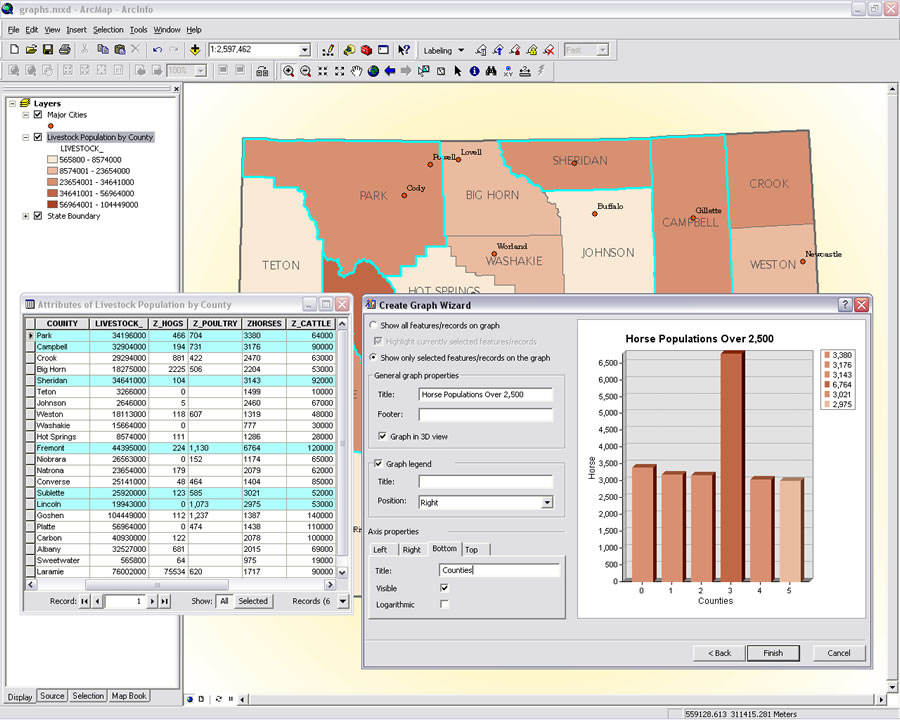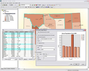 The new Create Graph Wizard lets you use only selected features in the graph. Even after the graph has been generated, the information displayed in the graph can be modified by querying attributes in the associated table, selecting features from the map, or selecting a portion of the graph.