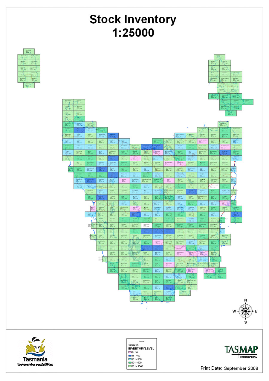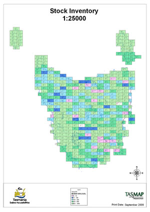 Even with these efficiencies, producing 415 maps is a large task, requiring many resources. So TASMAP also uses GIS technology to more effectively manage the workflow of determining when to produce maps for use and resale. "The question is always, Which map sheet do I work on?" says Chilcott. ArcGIS is useful in answering this question. Using ArcGIS, TASMAP has developed tools to assist in managing map production. A feature class of the map extent is linked to the stock database to produce reports of real-time stock levels. ArcGIS ModelBuilder is used to create a weighted matrix to identify which maps should be worked on over the next 12 months. Stock levels for the coming year and the highest-selling areas are also predicted.