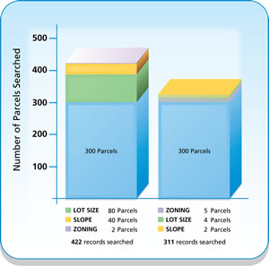To extend the previous example, you need to find not only parcels with a certain lot size and slope but also parcels that are zoned for a specific commercial use. If you know that most parcels in this area are zoned for residential use, you can eliminate those records first to decrease the total number searched. This means that the query
