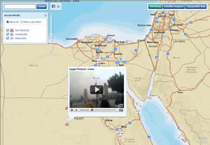 VGI, or locational crowdsourcing—where citizen volunteers contribute data that's georeferenced, then disseminated—is particularly useful in emergency applications because the information's timeliness is especially valuable. For example, Esri created the online Egypt Events Map just after anti-government rallies began in Tahrir Square, Cairo, on January 25, 2011. The map, now called the Middle East Protests Map, pulled in social media related to the protest in real time. Though only a few Twitter, YouTube, and Flickr posts appeared initially because the government shut down the Internet early on, the number expanded as restrictions eased.