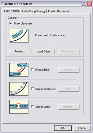 To access other placement settings, such as offsets or spacing, click the Properties button in the Placement Properties section of the Label Manager dialog box. Click the Label Position tab of the Placement Properties dialog box. This tab provides choices for controlling how often a label will appear on a street, spacing between characters, and words in a label. The other two tabs on the Placement Properties dialog box contain additional controls for fitting labels and resolving label conflicts.