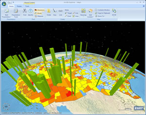 ArcGIS Explorer 900, set for release in the second quarter of this year, will make geospatial visualization and analysis on the Web easier than ever, in 2D or 3D. The flagship geospatial visualization tool is a free, lightweight, and downloadable application that lets users query and analyze data from online sources, fuse it with their own local content, then map the data on virtual globes. The application's latest iteration will come with new presentation tools and an easy-to-use ribbon interface.