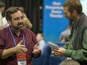 ![]() Bern Szukalski, product manager for the ArcGIS Explorer team, (left) speaks with an attendee at the 2009 Esri Developer Summit. |