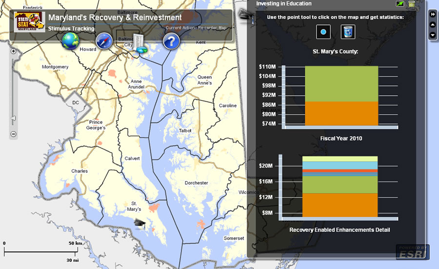 A recovery section has recently been added to the site with an ArcGIS Server software-based map to show how money from the federal government's American Recovery and Reinvestment Act will be spent. The data is accessible from the StateStat site and uses the MD iMap basemap (www.statestat.maryland.gov/). Currently, highway infrastructure, mass transit, public safety, health care, housing, workforce, and education data is available. Soon, the StateStat home page will feature an interactive map that will allow visitors to access more StateStat data and statistics.
