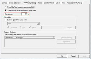 - Move the polygon layer so it is above the imagery layer and make it transparent. You can do this from Layer Properties. Activate the Display tab and change the Transparent value from 0 percent to something like 50 percent.