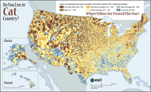 By mapping Esri data, it is easy to see where demand is the highest and lowest for dog and cat treats and where dogs dominate and cats rule.