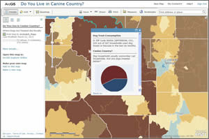 Starting with a map template for interactive demographic web maps, the data was added to ArcMap in ArcGIS for Desktop as a file geodatabase and analyzed to find patterns in the demand. Colors were chosen to emphasize areas of high demand as well as those with low demand. Once each map was reviewed using a web map publishing checklist and approved for publication, it was published as a service from ArcGIS for Desktop directly to an Amazon cloud server running ArcGIS for Server. Then a simple web map was created in ArcGIS Online with pop-up windows highlighting key information about each area such as how many households used dog and cat treats and the numbers of households with dogs compared to the number with cats. Each web map was then configured in ArcGIS Online as an embeddable application and inserted into an HTML page. (To create an interesting thumbnail for maps like this in ArcGIS Online, follow this tip.)