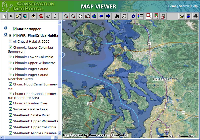 If the metadata describes and links to a live Internet map service, users can view and interact with the map service within the GeoPortal's Map Viewer, which streams the data in directly from the publisher's map server. With the Map Viewer, users can zoom and pan, identify features, and save the map view to open later or share with others via a permanent URL that can be e-mailed or added to their Web sites. What is especially unique and useful is that the Map Viewer lets users overlay or mash up data layers from different map servers, which may be hosted by different organizations using different protocols (e.g., ArcIMS, Web Map Server [WMS]).