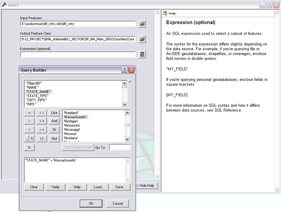 - Still on the dialog box, click the SQL button. Use the Query Builder to create an expression that will extract the desired data subset. In this case, the expression "STATE_NAME" = 'Massachusetts' was used to select all the counties in Massachusetts. Click OK to run the Extract tool.