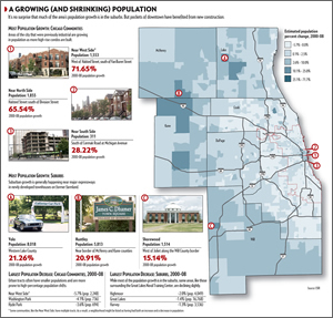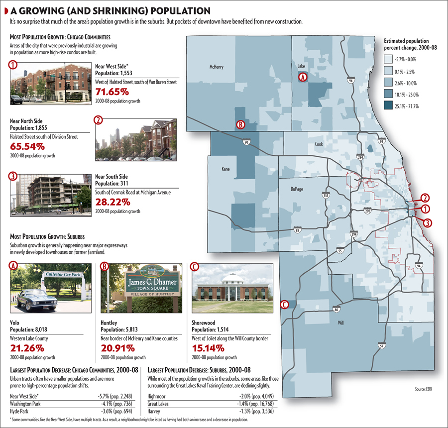 ![]() This map, using data from Esri, shows where the population is growing and declining in the Chicago area. |