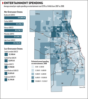 ![]() This map shows that the average annual spending per household on entertainment was highest in the Kenilworth neighborhood of Chicago. |