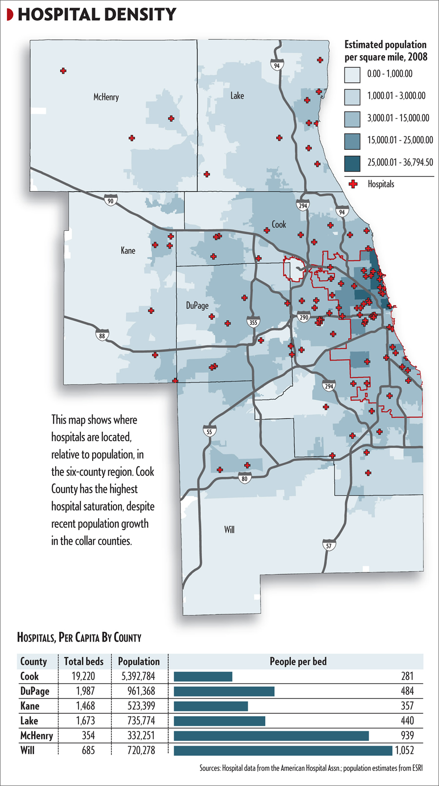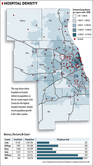 ![]() Matthew Carmichael of Crain's Chicago Business made this hospital density map using Esri's ArcGIS Desktop software. |