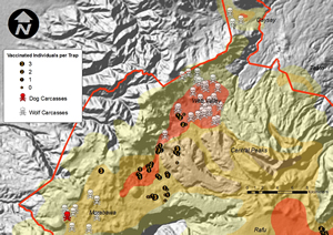 The intervention began on October 20, 2008. The objectives were to contain the rabies virus within the Web Valley and reduce the probability of the BMNP wolves becoming extinct by protecting wolf packs in other key adjacent subpopulations.