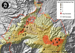Due in part to the information gained from mapping the outbreak, the EWCP received permission from Ethiopian conservation authorities to vaccinate 50 wolves against rabies. Permission for vaccinating wolves is only granted by the authorities once a rabies outbreak has occurred.