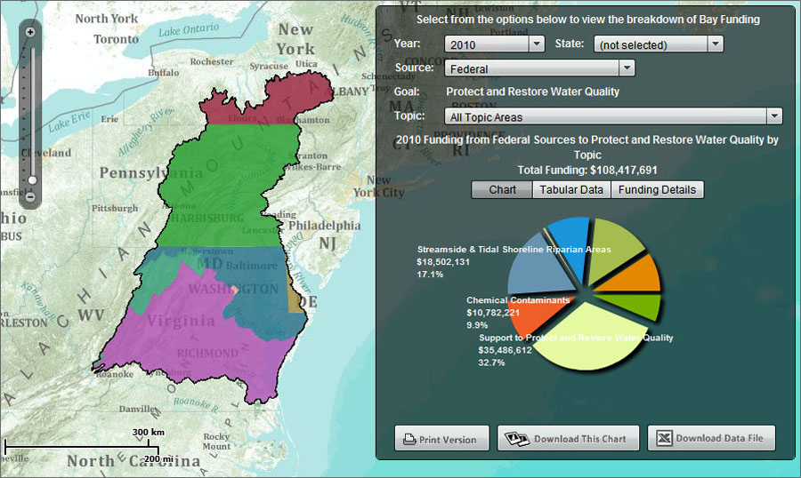 Finally, the Funding tab accesses information about the financial investments the partners are making to control pollution from various sources. The funding information can be sorted by year, state, source, goal, and topic.